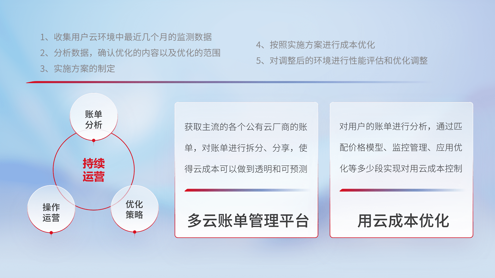 通过多云纳管,,以统一的资源数据模型把客户的云资源进行抽象和封装,,进而实现对多云资源的统一操作,,保障云资源管理的可靠性、、、、稳定性与可用性。。量身定制化运维内容,,,,配置、、开发运维、、补丁管理、、备份、、、、监控、、、、认证和访问管理、、、审计和日常巡检等,,,,保障在用云过程中的可靠度,,稳定度以及高可用率。。。。